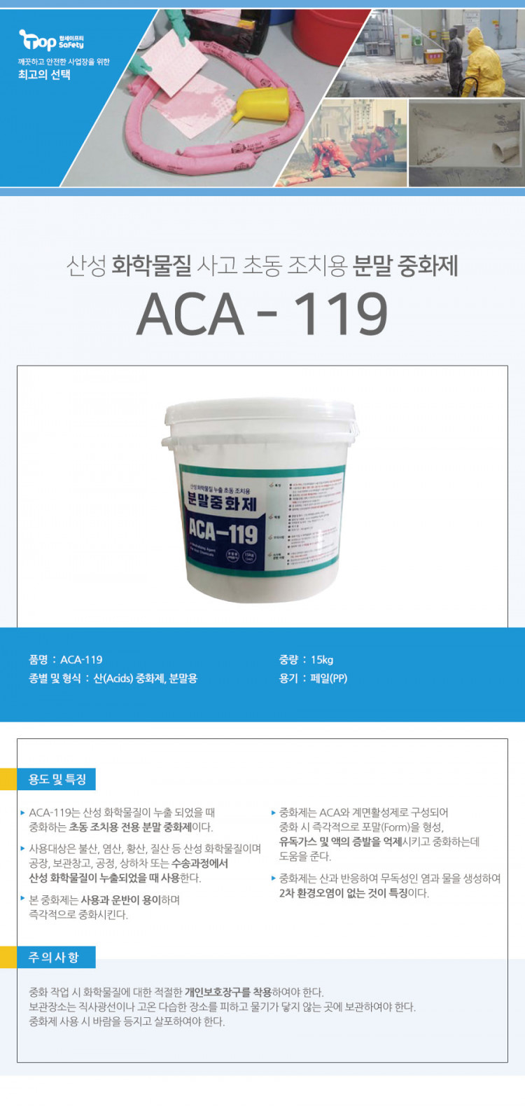 케미컬 분말중화제, ACA-119, 산(Acids) 중화제, 사고 초동 조치용, 케미컬 중화제 페이지 정보 작성자 관리자 댓글 0건 조회 308회 작성일 21-04-12 15:46 본문 제조사 국내 원산지 국내 목록 목록 이전글케미컬 분말중화제, BCA-119, 염기성(Base) 중화제, 사고 초동 조치용, 케미컬 중화제 21.04.12 다음글염기성물질 분말 중화제 폐일용기형, Spill-X-C , #76396, 염기성(Base) 중화제, 스필엑스, 케미컬 중화제 21.04.12